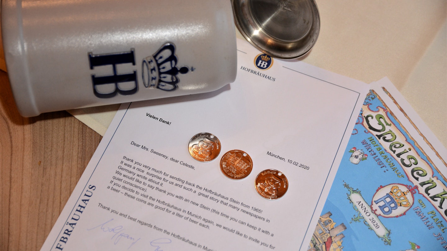 To thank her for her honesty, Hofbräuhaus sent Celeste a package with a new stein that she could keep (this time with a clear conscience) along with three special coins that are valid for a litre of beer each at the brewery.